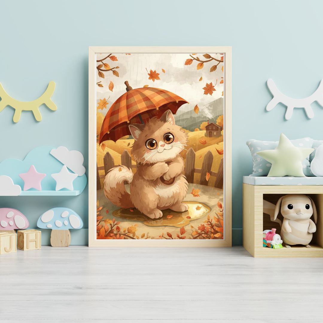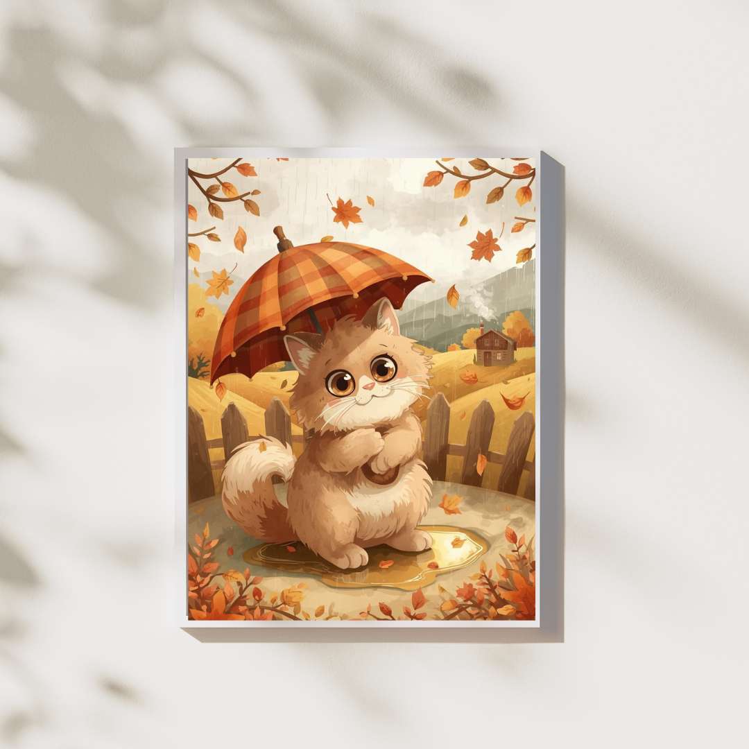 Muuta tilaasi tämän hurmaavan syysaiheisen kissan seinätaiteen avulla, jossa pörröinen kissanpentu suojaa itseään ruudullisen sateenvarjon alla kultaisten lehtien putoillessa ympärillä. Tämä viihtyisä syysmaalaismaisema vangitsee vuodenajan lämmön ja leikkisyyden rikas punertavan, kultaisen ja lämpimän ruskean sävypaletteineen, jotka tuovat mukavuutta mihin tahansa huoneeseen.